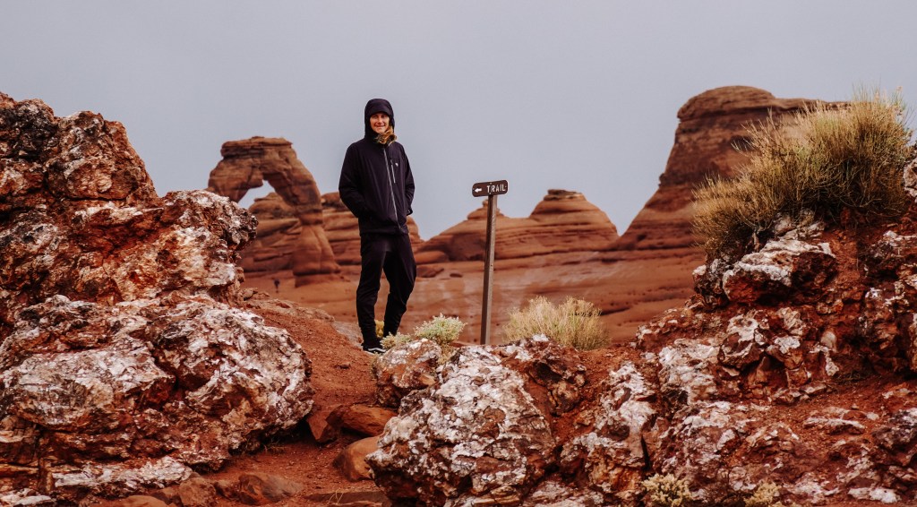 So we hoped in the truck, then made the short 5 minute drive to the entrance to Arches NP. Due to covid-19, the parks were operating with a limited staff and therefore weren’t charging an entrance fee! They offered us a free park map & cautioned us to watch for washouts and debris in the road due to the storm.