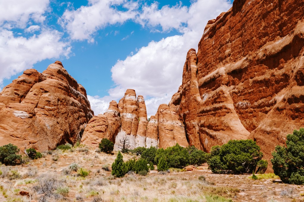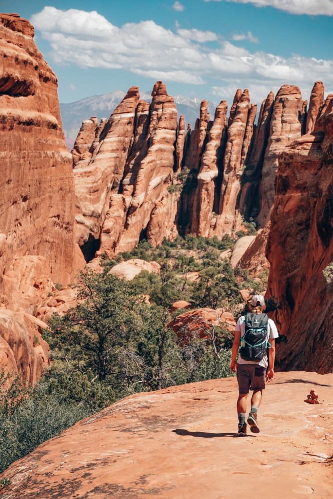 We really enjoyed this trail since a lot of other hikers seemed to stay close to the start of the trail, turning back after the first set of arches, leaving us to hike completely alone for most of the day! A total change from the Delicate Arch hike the night before. The highlights of Devil’s Garden are Landscape Arch, Navajo Arch, Partition Arch, Double O Arch, Dark Angel Monolith, Private Arch, and of course all the rock wall ‘fins’ along the way.