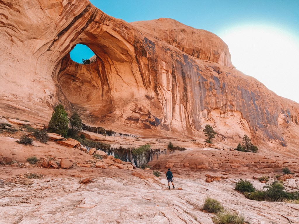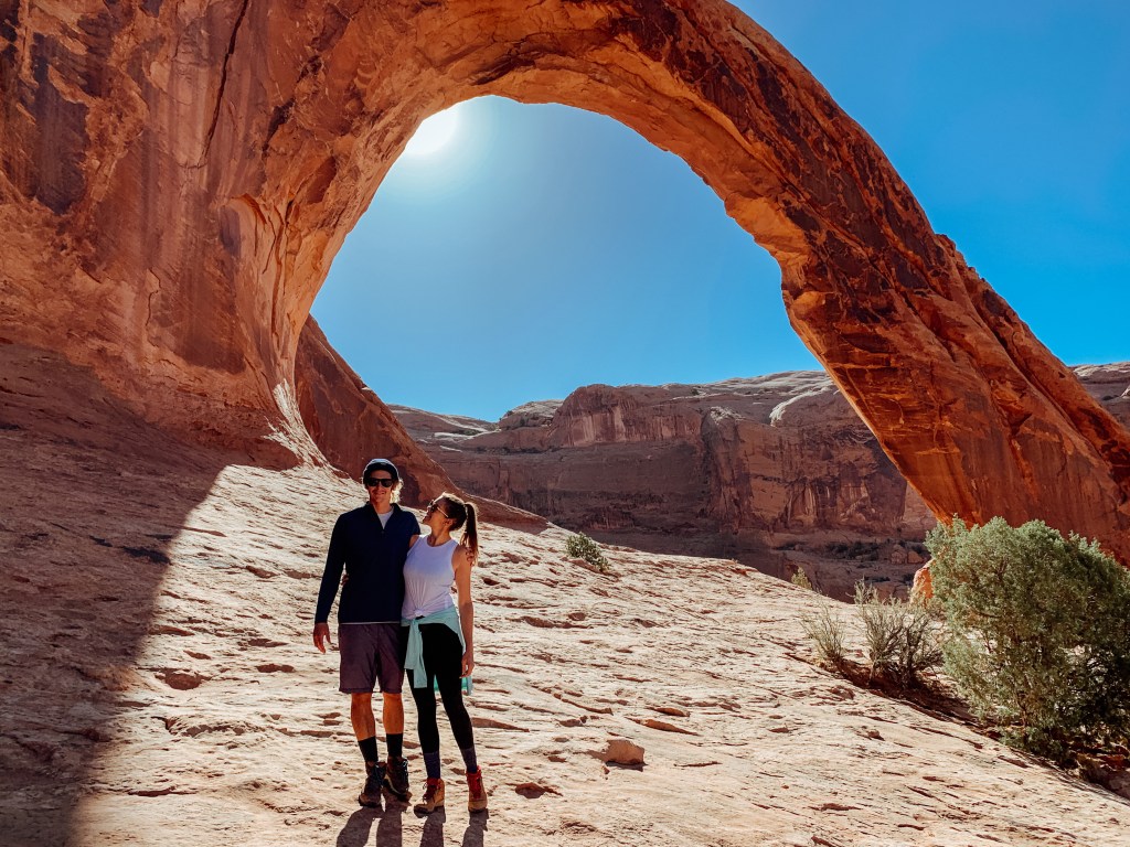 We awoke to silence. It was almost scary, but mostly amazing. Stefan whipped us up some coffee with the french press and we ate a quick breakfast of oatmeal before packing everything up and saying goodbye to our special campsite. A friend of ours had recommended a hike outside of the National Parks called Corona & Bowtie Arch. We hoped the trail would be less crowded due to it’s location and we wanted to hike it early since we were driving to Bryce Canyon right afterwards.